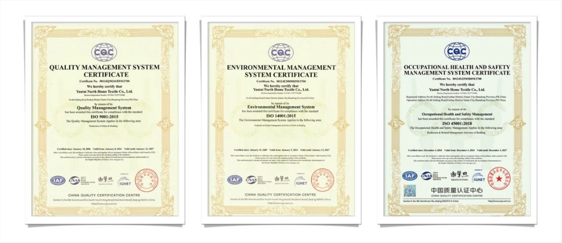 In terms of qualification certification, Northern Home Textiles has obtained ISO9001, 14001, and 45001 certifications for quality, environmental, health, and safety systems, as well as GOTS, OCS, GRS, and other organic and recycled product production qualifications. In terms of environmental protection and health, the company's products have obtained OEKO100 certification and OEKO STEP six-system verification, using internationally recognized high-end environmentally friendly materials such as good cotton, European linen, American cotton, and Lenzing Tencel™.